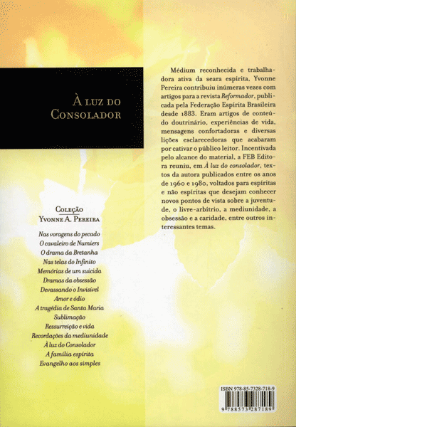 Médium reconhecida e trabalhadora ativa da seara espírita, Yvonne Pereira contribuiu inúmeras vezes com artigos para a revista Reformador, publicada pela Federação Espírita Brasileira desde 1883. Eram artigos de conteúdo doutrinário, experiências de vida, mensagens confortadoras e diversas lições esclarecedoras que acabaram por cativar o público leitor. Incentivada pelo alcance do material, a FEB Editora reuniu, em À luz do consolador, textos da autora publicados entre os anos de 1960 e 1980, voltados para espíritas e não espíritas que desejam conhecer novos pontos de vista sobre a juventude, o livre-arbítrio, a mediunidade, a obsessão e a caridade, entre outros interessantes temas.