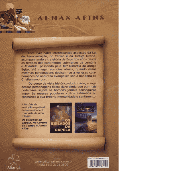 Este livro ” Almas Afins ” narra interessantes aspectos da Lei da Reencarnação, do Carma e da Justiça Divina, acompanhado da trajectória de Espíritos afins desde os tempos dos continentes submersos da Lemúria e Atlântida, passando pela 18ª Dinastia do antigo Egito, até chegar aos dias atuais, quando essas mesmas personagens dedicam-se a valiosas colaborações de natureza evangélica sob a bandeira do Cristianismo puro.