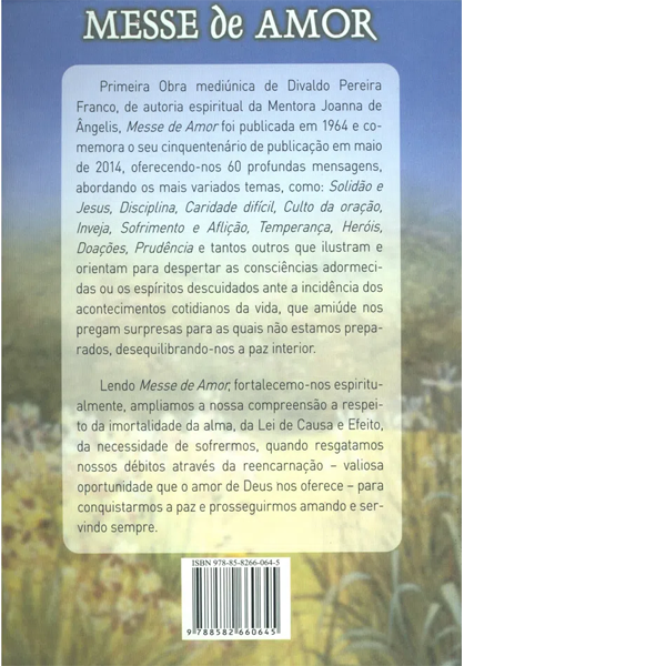 Lendo Messe de Amor, fortalecemo-nos espiritualmente, ampliamos a nossa compreensão a respeito da imortalidade da alma, da Lei de Causa e Efeito, da necessidade de sofrermos, quando resgatamos nossos débitos através da reencarnação. valiosa oportunidade que o amor de Deus nos oferece. para conquistarmos a paz e prosseguirmos amando e servindo sempre.