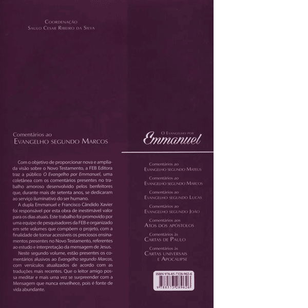 Esta obra ” O Evangelho por Emmanuel – Comentários ao Evangelho Segundo Marcos “, tem o objectivo de proporcionar nova e ampliada visão sobre o Novo Testamento, a FEB Editora traz a público O Evangelho por Emmanuel, uma colectânea com os comentários presentes no trabalho amoroso desenvolvido pelos benfeitores que, durante mais de setenta anos, se dedicaram ao serviço iluminativo do ser humano. A dupla Emmanuel e Francisco Cândido Xavier foi responsável por esta obra de inestimável valor para os dias actuais.