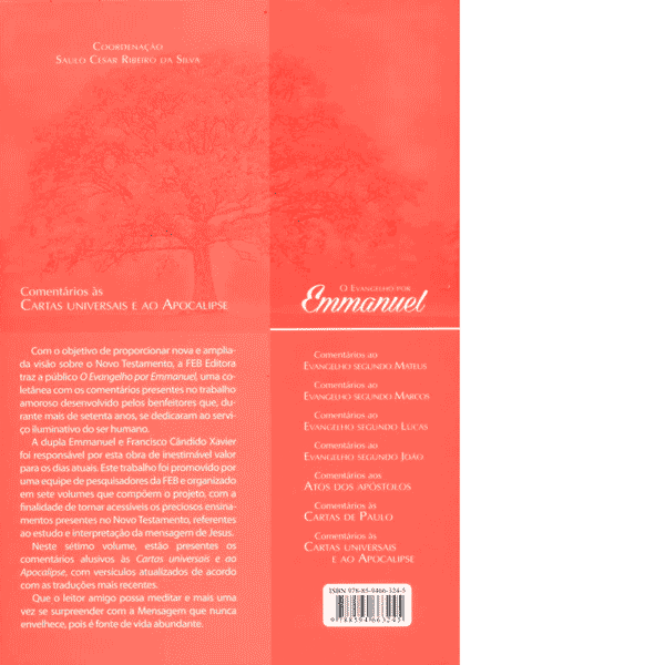 Esta obra ” O evangelho por Emmanuel: comentários às cartas universais e ao apocalipse “, tem o objectivo de proporcionar nova e ampliada visão sobre o Novo Testamento, a FEB Editora traz a público O Evangelho por Emmanuel, uma colectânea com os comentários presentes no trabalho amoroso desenvolvido pelos benfeitores que, durante mais de setenta anos, se dedicaram ao serviço iluminativo do ser humano. A dupla Emmanuel e Francisco Cândido Xavier foi responsável por esta obra de inestimável valor para os dias actuais. Este trabalho foi promovido por uma equipe de pesquisadores da FEB e organizado em sete volumes que compõem o projecto, com a finalidade de tornar acessíveis os preciosos ensinamentos presentes no Novo Testamento, referentes ao estudo e interpretação da mensagem de Jesus. Neste quinto volume, estão presentes os comentários alusivos aos Atos dos apóstolos, com versículos actualizados de acordo com as traduções mais recentes. Que o leitor amigo possa meditar e mais uma vez se surpreender com a Mensagem que nunca envelhece, pois é fonte de vida abundante.